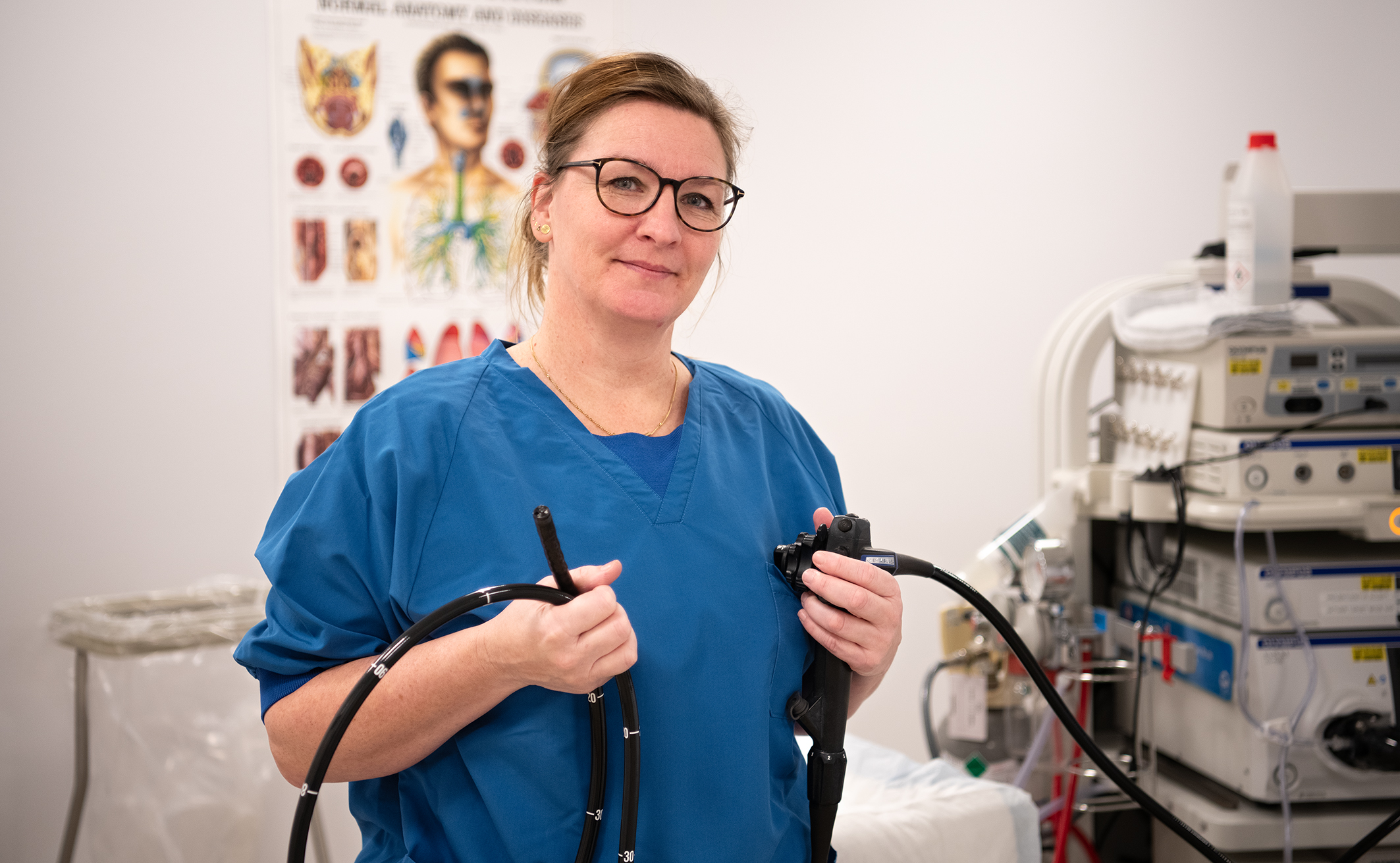 Jeg hjælper også en kollega med at fjerne nogle polypper ved en koloskopi. Der er rigtig meget sidemandsoplæring på vores område. Det er et håndelag, en tilgang, en viden og en erfaring i alt, hvad vi gør. Vi skal hele tiden afkode, hvad det er for en patient, og hvad er det for en undersøgelse? Er patienten nervøs? Er undersøgelsen teknisk svær, og skal der for eksempel fjernes polypper eller tages vævsprøver.